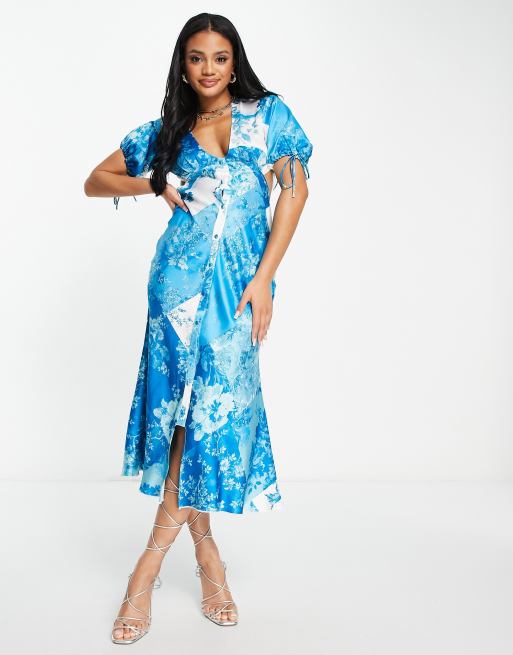 ASOS DESIGN satin midi dress with button through detail in patchwork blue floral Very well made.