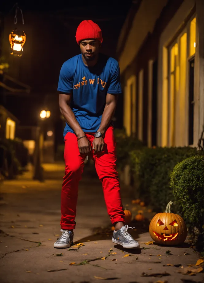 Lexica he is wearing a red shirt and blue pants Very well made.