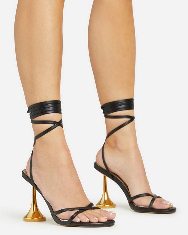 Sylvie Lace Up Cross Strap Detail Gold Statement Heel In Black Faux Leather Very well made.