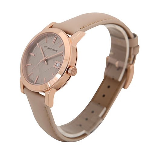 Burberry Luxury Rare Rose Gold Watch Womens Unisex Men The City Beige Authentic Leather Beige Dial Date BU9109 Very well made.
