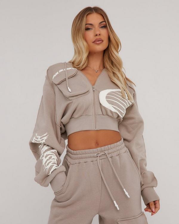 Long Sleeve Made On Earth Graphic Slogan Print Cropped Hoodie In Taupe Very well made.