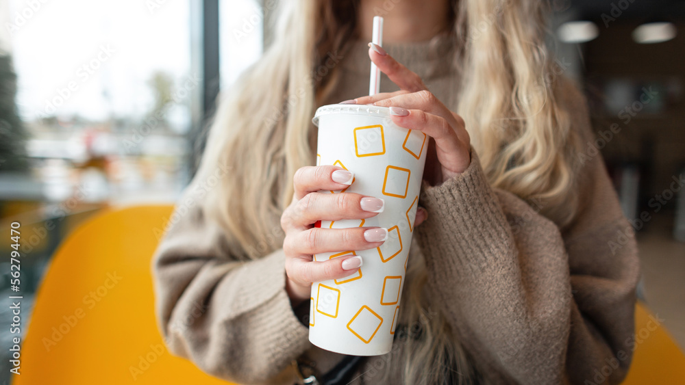 Beautiful girl in a beige sweater sits in a cafe and holds a paper Very well made.