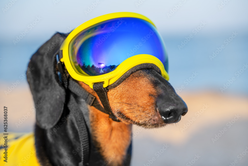 Cool sports dachshund dog in specialized sunglasses for pets with Very well made.