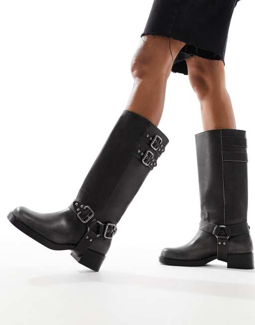 Stradivarius buckle detail biker boots in washed grey Very well made.