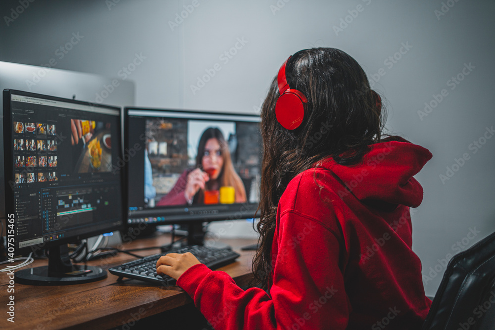 Mujer joven editando video en dos monitores con aud fonos sudadera Very well made.
