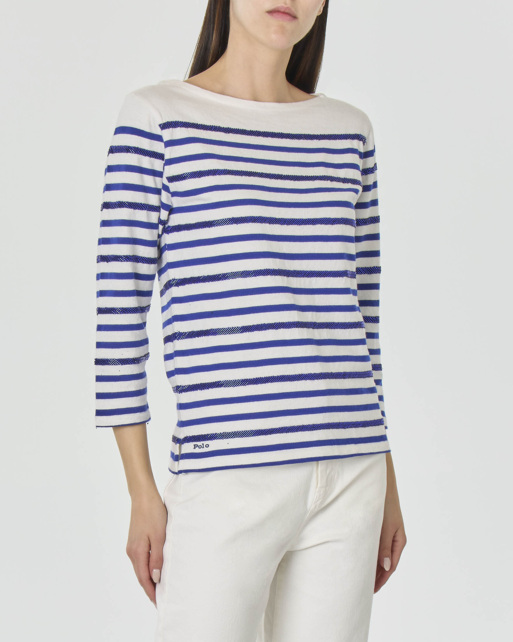T shirt in cotone bianca a righe blu con perline applicate e Very well made.