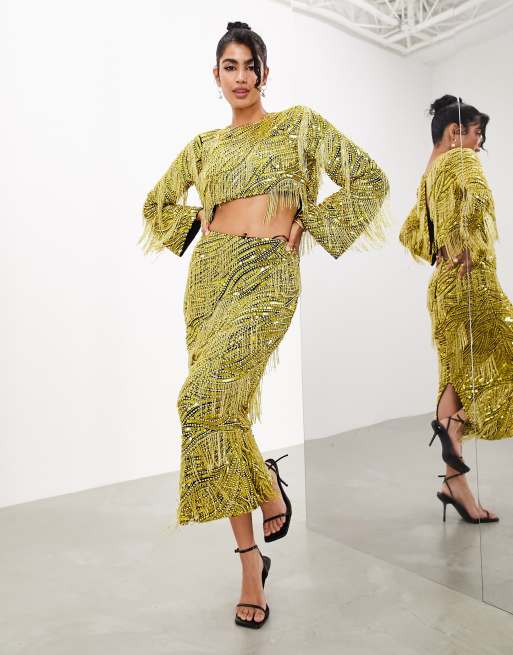 ASOS EDITION beaded fringe and pearl midi skirt in black and yellow Very well made.