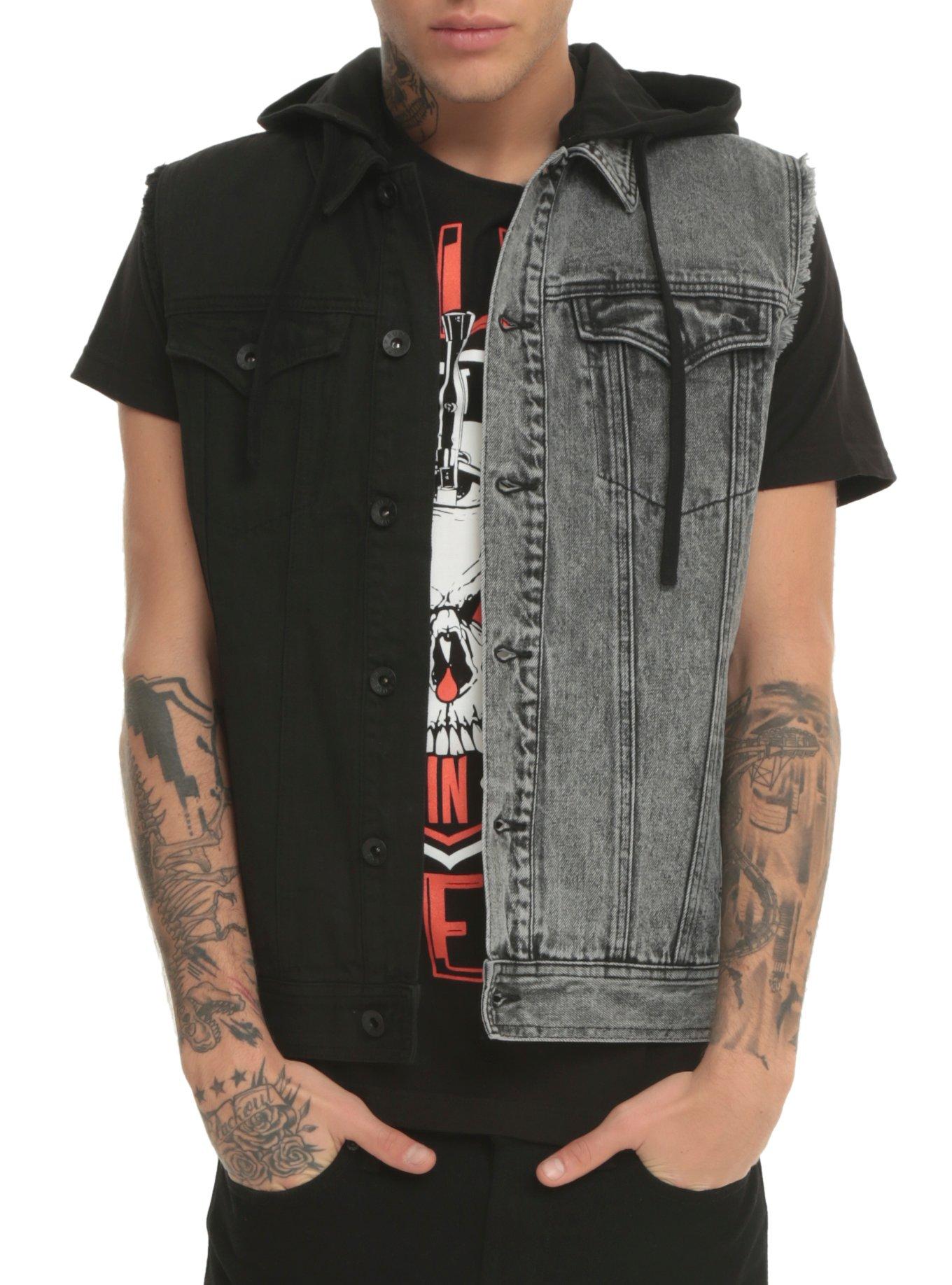 RUDE Black Grey Split Denim Hooded Vest Hot Topic Very well made.