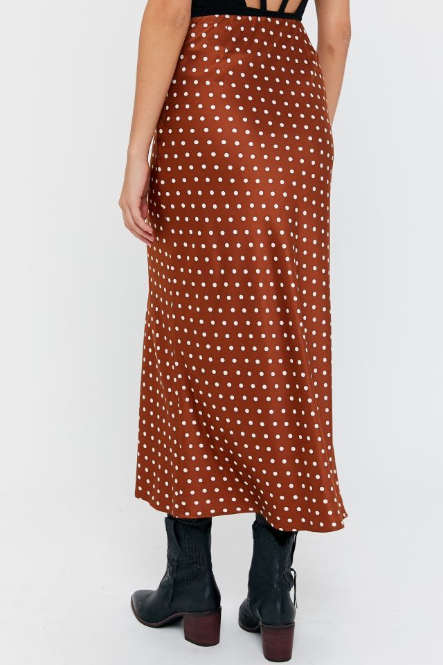 JOA Women s J.O.A. Polka Dot Asymmetrical Ruched Midi Skirt Mahogany XS at Amazon Women s Clothing store Very well made.