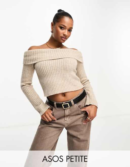 ASOS DESIGN Petite off shoulder jumper in chunky rib in oatmeal Very well made.