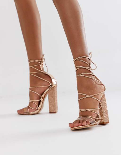 Public Desire Sparkle rose gold rhinestone clear detail tie up heeled sandals Very well made.