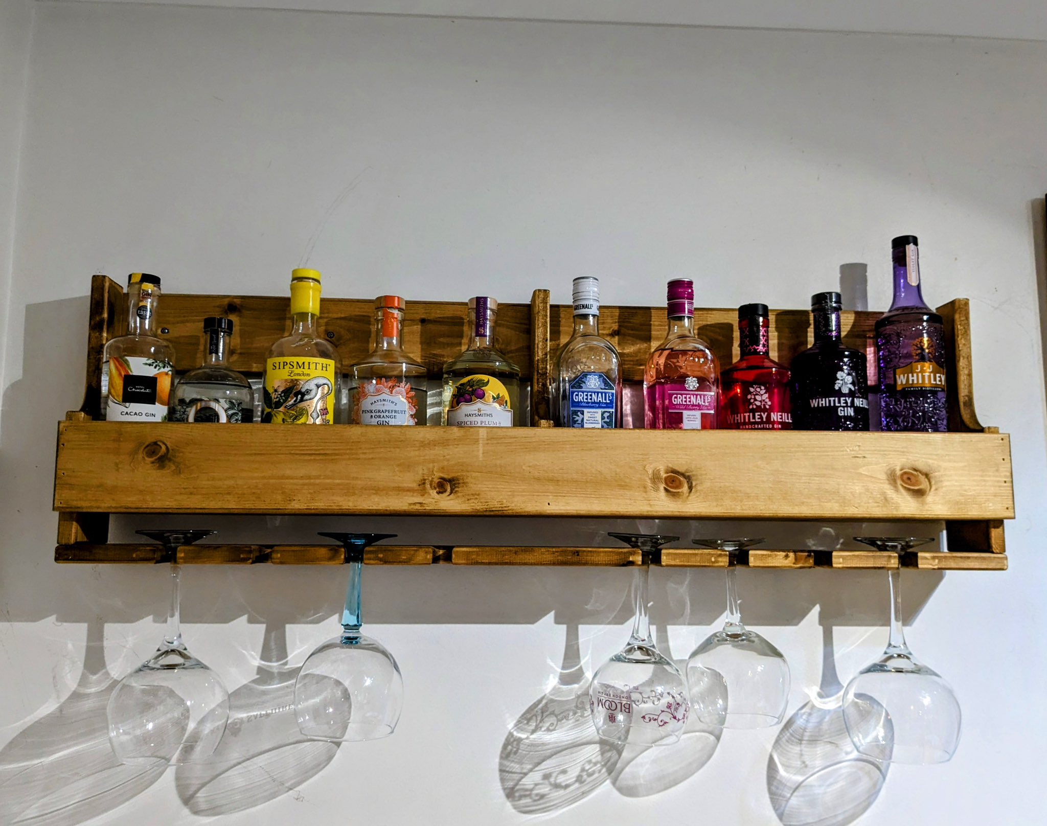 Handmade Bespoke Reclaimed Wooden Gin Rack and Floating Bottle Very well made.
