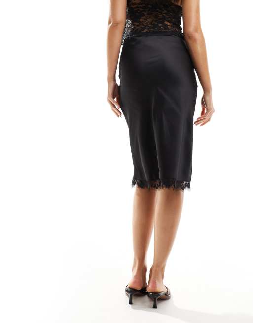 ASOS DESIGN 90 s length satin skirt with lace trim in black Very well made.