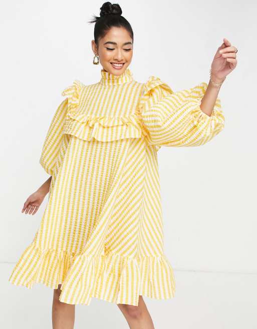 ASOS EDITION textured ruffle mini dress with high neck in yellow stripe Very well made.