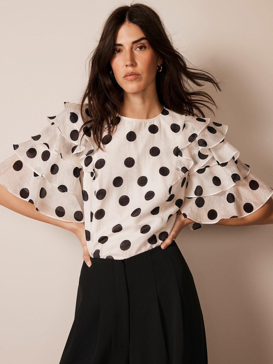 Mint Velvet Polka Dot Ruffle Linen Blend Top White Black Very well made.
