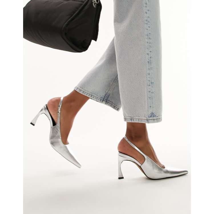 Topshop Coy premium leather sling back heeled court shoe in silver Very well made.