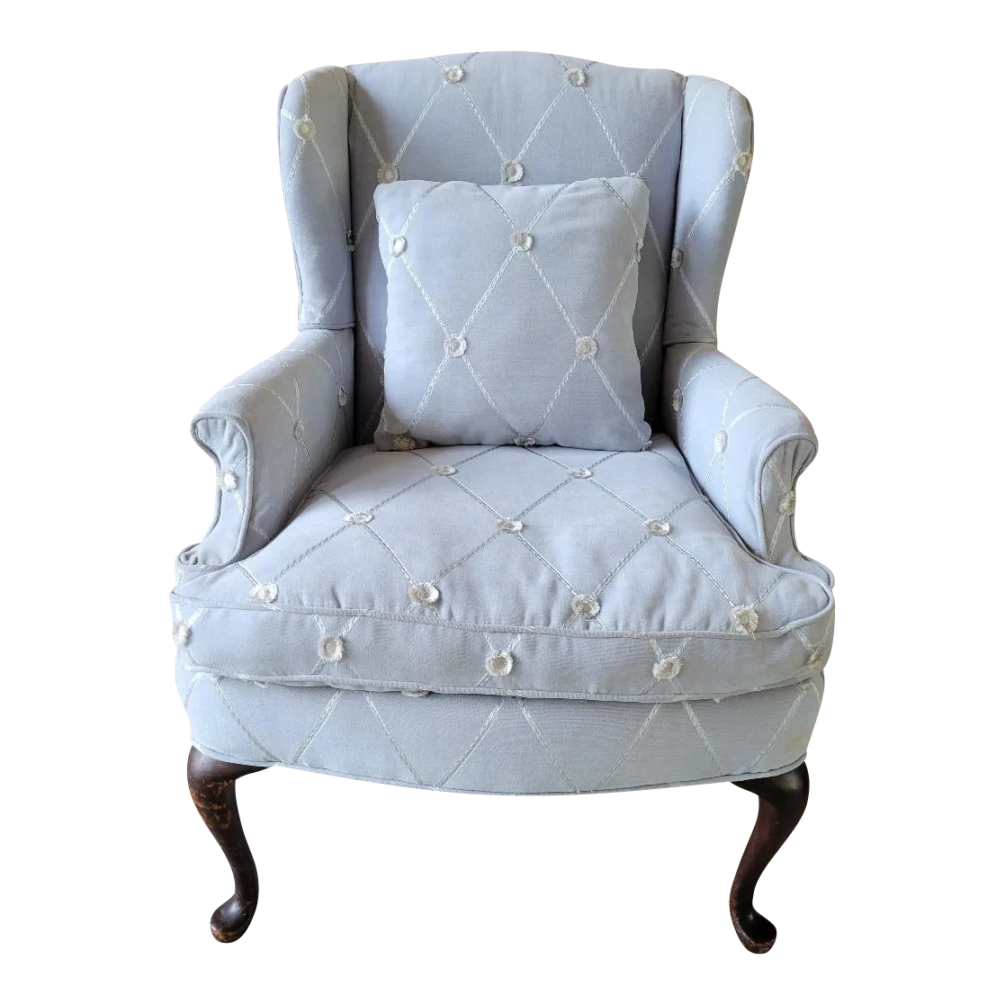 Vintage Light Blue Designer Fabric Queen Anne Style Wingback Chair Very well made.