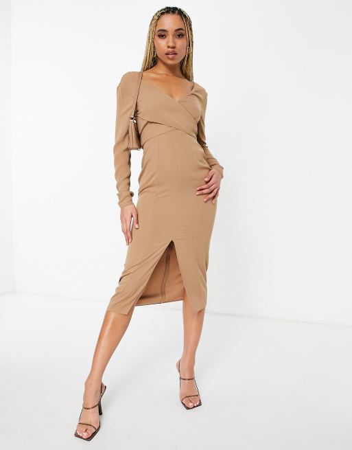 ASOS DESIGN Vestito longuette midi a maniche lunghe beige con corpino avvolgente e allacciatura Very well made.