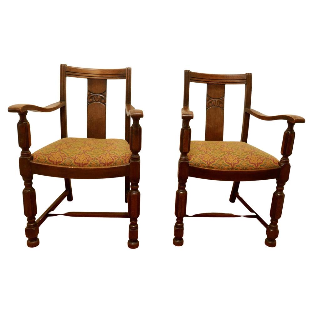 Arts Crafts Golden Oak Carver Chairs 1920s Set of 2 for sale Very well made.