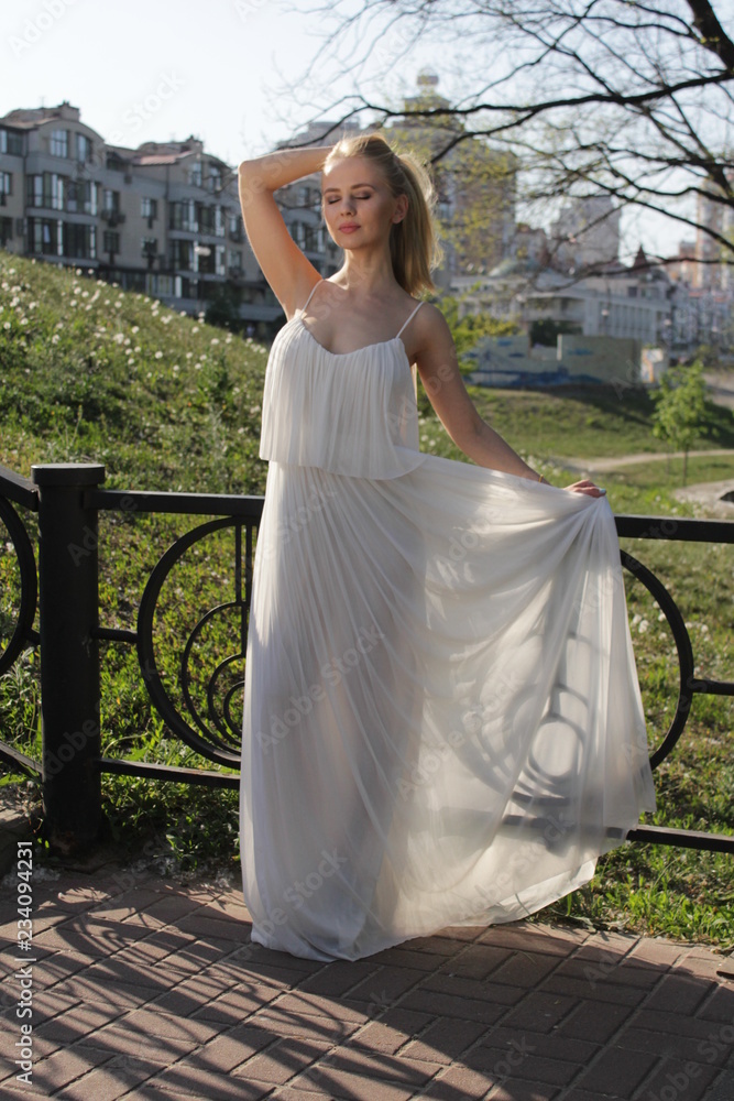 young blonde girl in a white semi transparent dress in the sun Very well made.