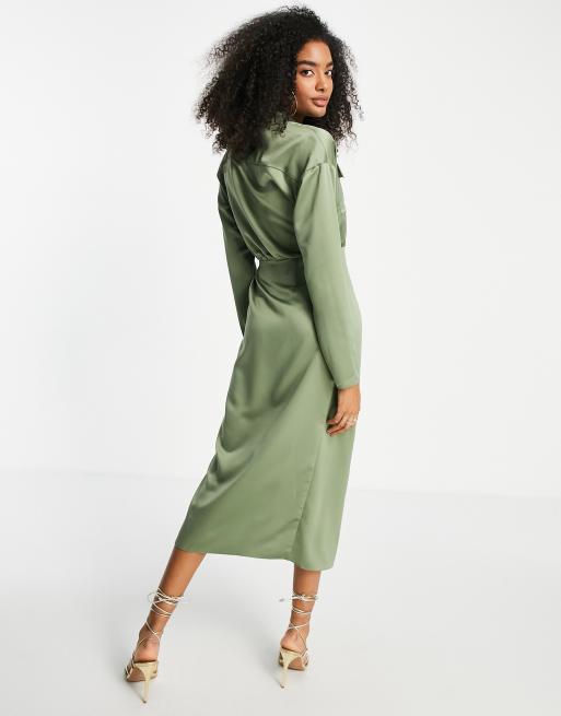 ASOS DESIGN Robe chemise mi longue effet crois en satin avec col Kaki Very well made.