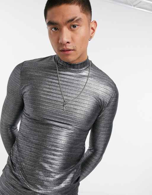 ASOS DESIGN co ord muscle long sleeve t shirt with turtle neck in silver metallic fabric Very well made.