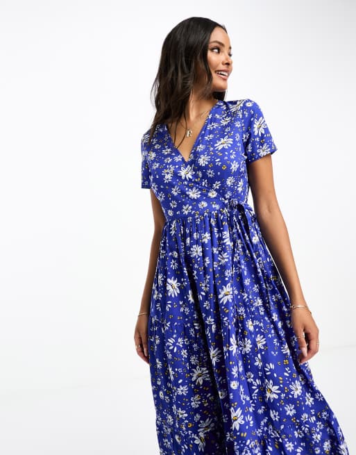 Influence tiered wrap front midi dress in blue floral print ASOS Very well made.