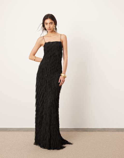 ASOS EDITION Strukturiertes Maxi Tragerkleid in Schwarz mit tiefem Ruckenausschnitt und Fransenbesatz Very well made.