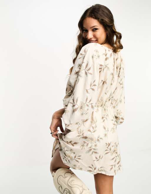 Free People floral print balloon sleeve boho mini dress in cream Very well made.