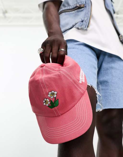 ASOS DESIGN soft baseball cap with flat peak and flower embroidery in pink ASOS Very well made.