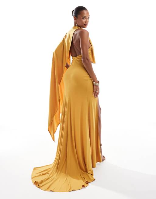 ASOS DESIGN Red Carpet Maxikleid in Burgunderrot mit One Shoulder Cape und Schleppe Very well made.