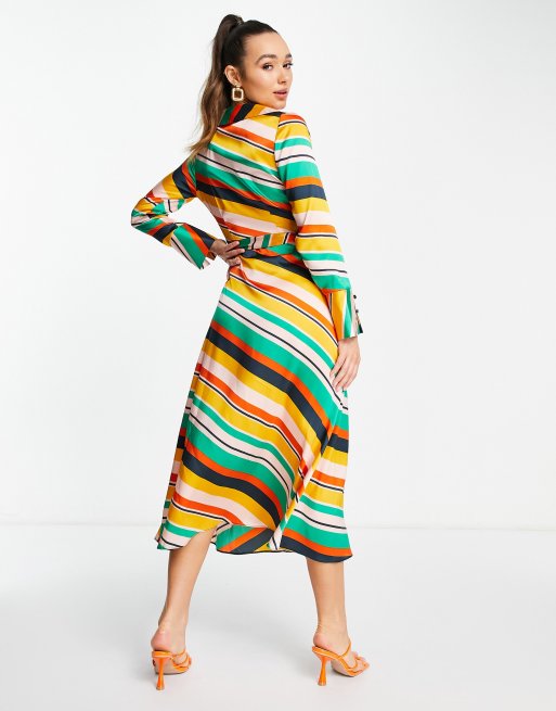 ASOS DESIGN satin wrap midi dress with collar in bright multi stripe Very well made.