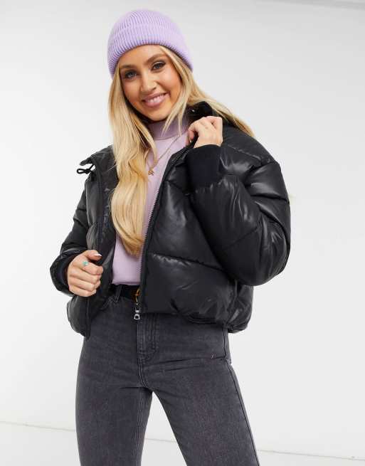 Monki Amber Doudoune courte en imitation cuir avec capuche Noir Very well made.
