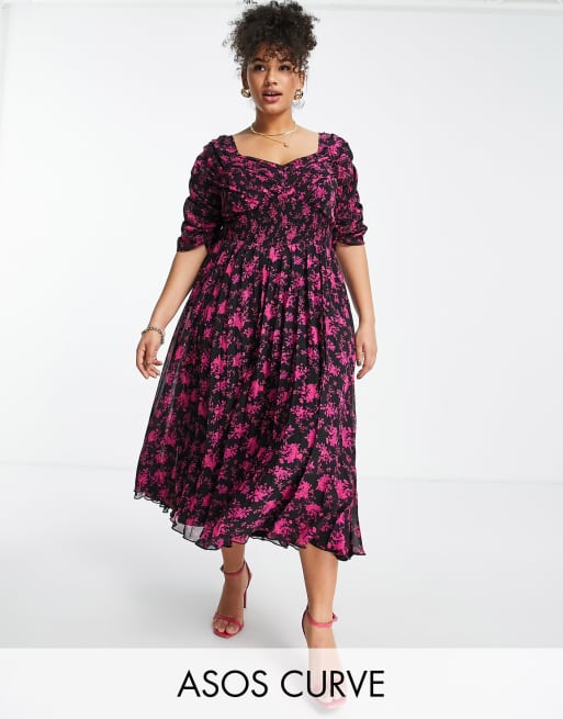 ASOS DESIGN Curve ruched front pleated midi dress with shirred waist in black floral print ASOS Very well made.