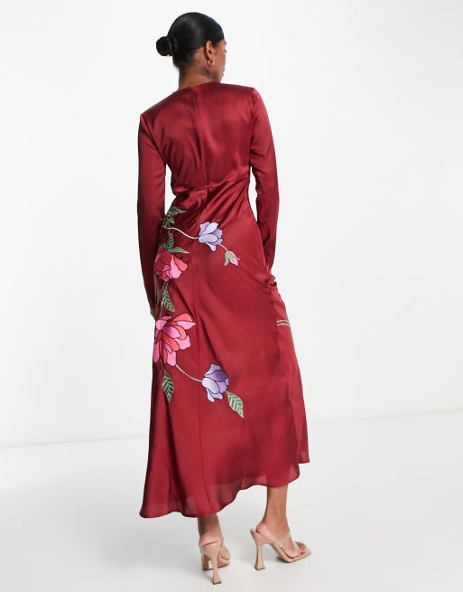 ASOS DESIGN embroidered satin long sleeve maxi dress in berry red ASOS Very well made.