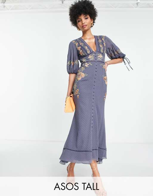 ASOS DESIGN Tall dobby floral embroidered midi tea dress with tie detail in blue Very well made.