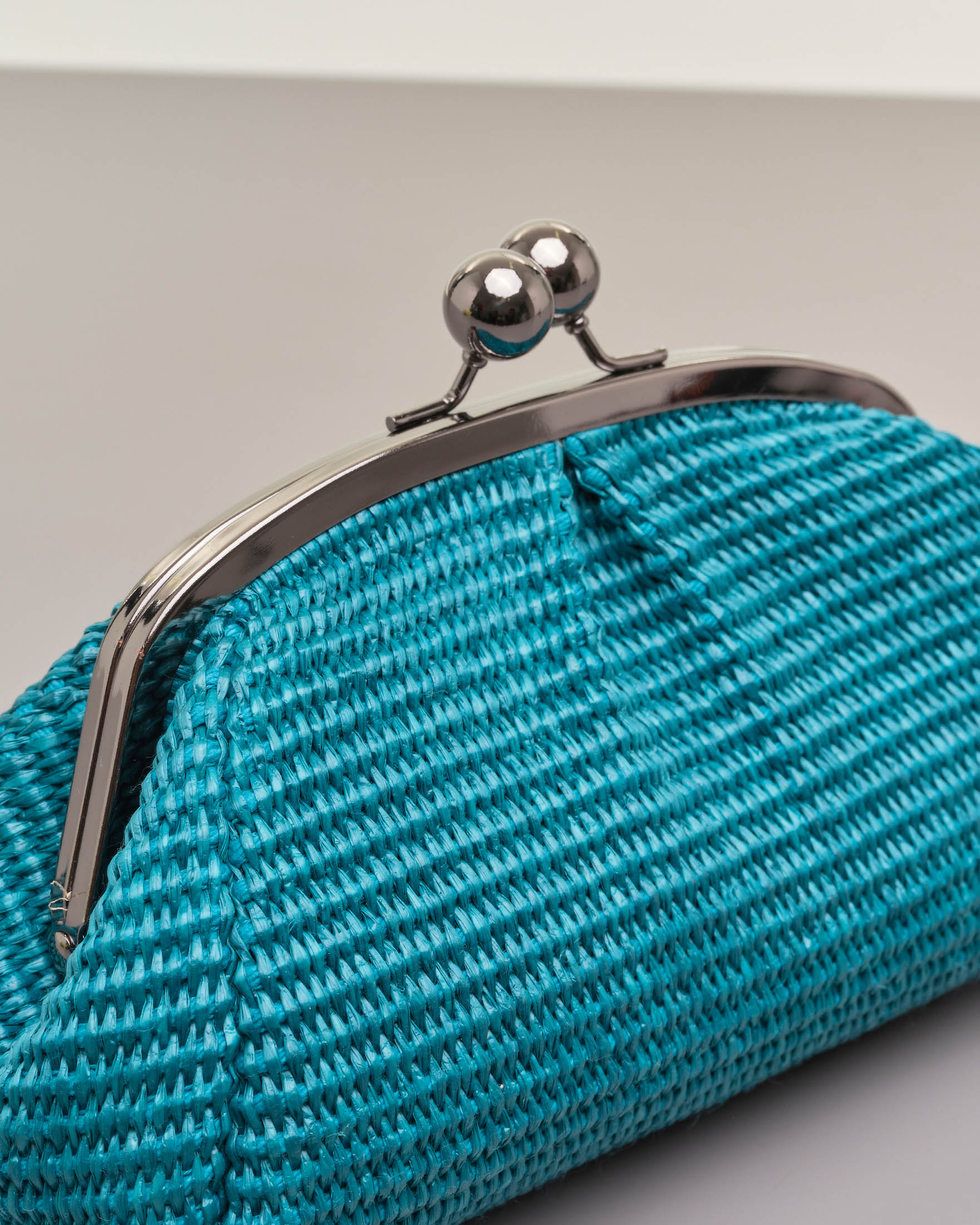Borsa mini color ottanio in raffia con chiusura a clip in metallo Very well made.