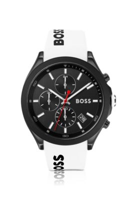 BOSS Black plated chronograph watch with white logo strap Very well made.