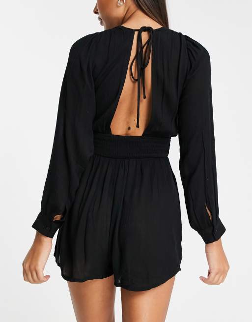 ASOS DESIGN Combishort chemise fluide manches longues effet lin Noir Very well made.