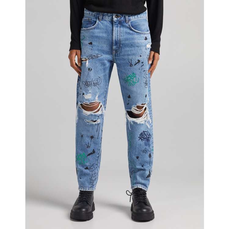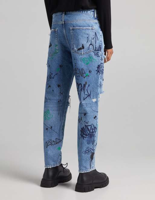 Bershka straight ripped jeans with graffiti print in blue Very well made.