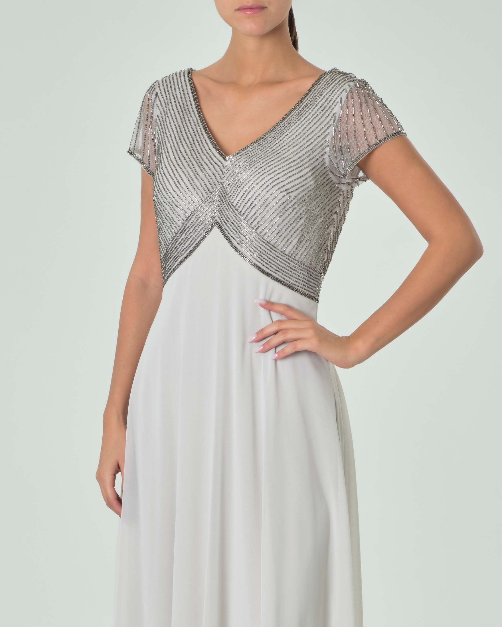 Abito lungo grigio perla stile impero in tulle con ricami in perline silver sul busto Very well made.