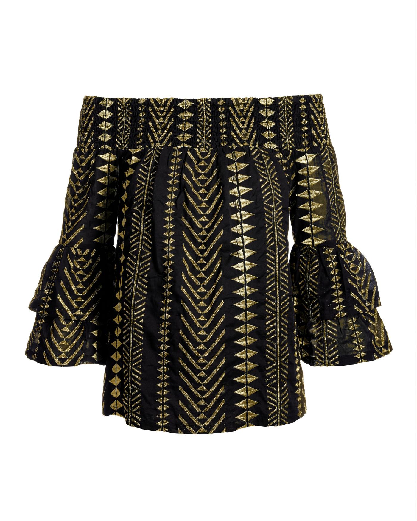 Gold Metallic Patterned Off the Shoulder Tiered Sleeve Blouse Black Gold Boston Proper Very well made.