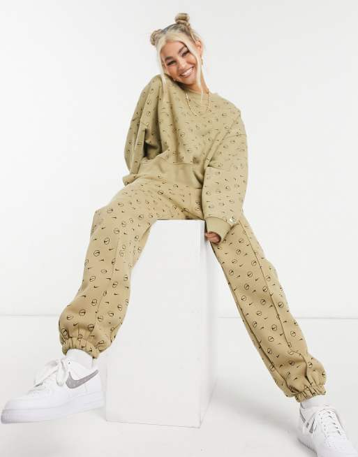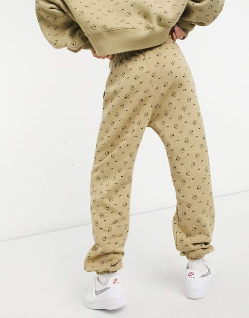 Nike all over logo print joggers in camel Very well made.